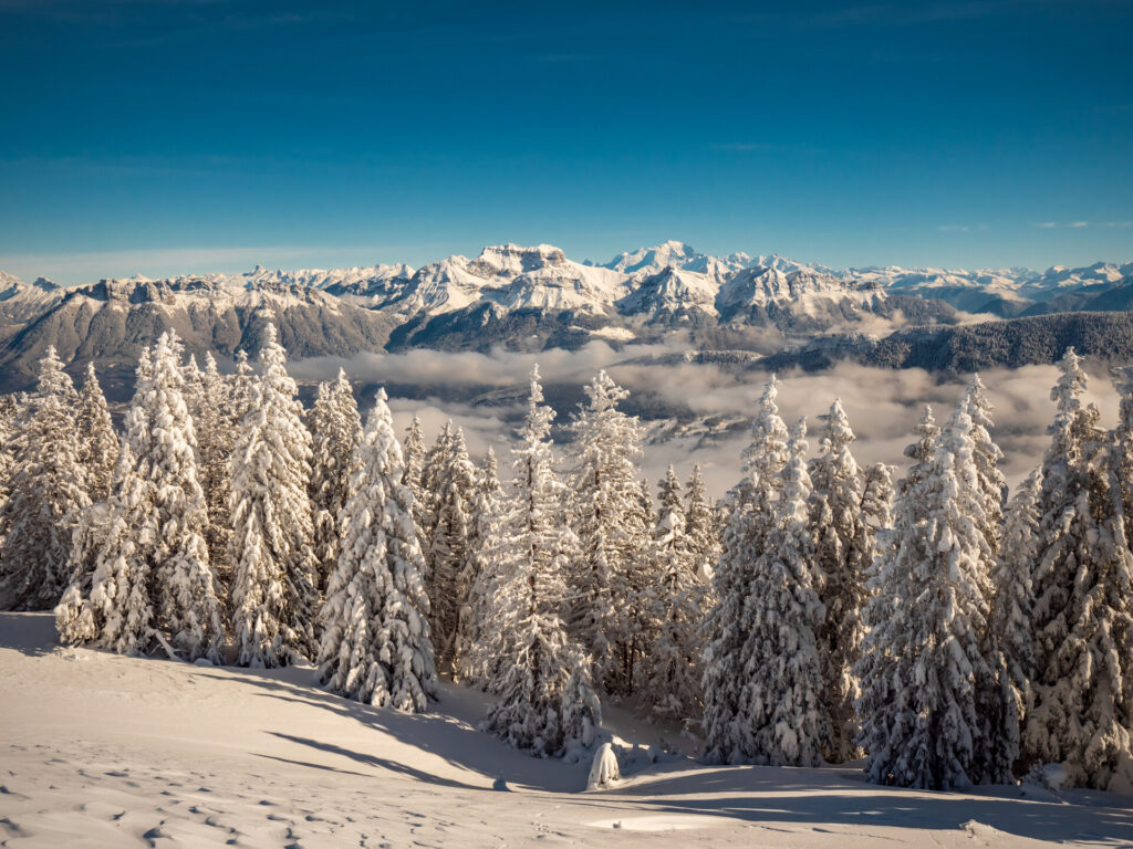 Monté Médio vous propose une sortie randonnée en raquette autour d’Annecy. Partez à la découverte des montagnes enneigées avec un accompagnateur en montagne.